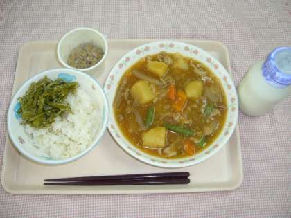 今日は、1年生から4年生までが飯盒炊さんに出かけているので、5年生と6年生それから、教職員あわせて30人分の給食です。こんだては、麦ごはん・納豆・韓国風肉じゃが・茎わかめのにんにく炒め・牛乳です。少しの量でも、おいしくなるように一所懸命に作りました。