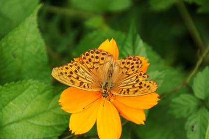 ツマグロヒョウモンのオスも、オレンジコスモスの蜜を吸いに来ていました。
