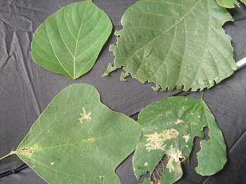 ☆左に4枚の写真があります。左上のものはふつうのクズの葉です。ほかはどれもいろいろな虫が葉っぱを食べたようすがわかるものです。生き物そのものでなくても、その生きていたようすを知ることは楽しいことです。