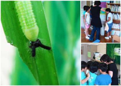 三連休のうちに、チョウチョの幼虫が脱走し、本棚の裏にいました。みんなで捕獲してススキの鉢植えに移してあげました。どうして「脱走」したのかは分かりません。