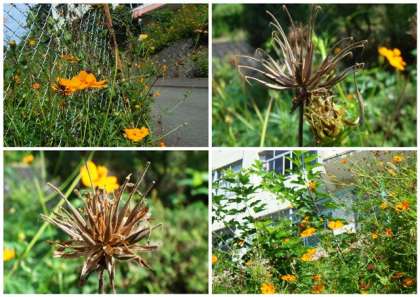 恩二小では今、「オレンジコスモス」が満開です。4年前から増殖させてきた成果です。チョウチョが乱舞しています。