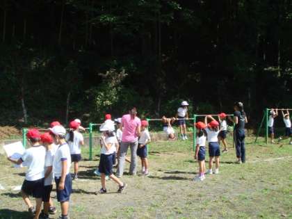 秋晴の中、2校時に1〜2年生が体育の授業で「鉄棒」をしていました。
