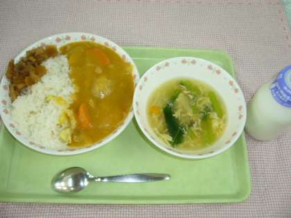 今日から10月です。すっかり涼しくなって、一気に秋がやってきました。今日の給食は、秋のカレーライス・たまごスープ・福神漬け・牛乳です。秋のカレーライスは、いつものカレーライスとはちがって、じゃが芋のかわりにさつまいもが入っています。それからもう一つ、恩二小の秋の味覚『クリ』をごはんと一緒に炊き込みました。今年も恩二小のクリの木はたくさんの実をつけています。これからも、どんどん給食で使用していきますのでお楽しみに!