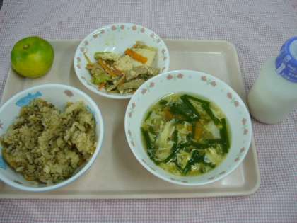 今日の給食は、ししじゅうし・豆腐チャンプル・ニラたまスープ・くだもの(みかん)・牛乳です。
