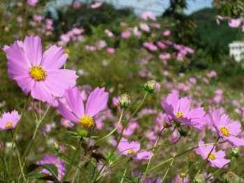 ☆コスモス(Cosmos)というのは学名(がくめい)で世界共通語です。日本では秋のサクラのようなので、秋桜。もともとはメキシコの高原地帯にさいているものです。日本には100年ちょっと前に来ました。