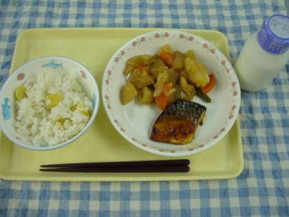 今日の給食は、栗ごはん・サバのカレー焼き・野菜のうま煮・牛乳です。今日の栗は、3年生・5年生の担任の先生と、音楽の先生、副校長先生、事務の方に手伝って剥いたものです。みんな手が痛くなるまでがんばってくれました。栗を剥くのはとても大変です。お手伝いをしてくれた先生方、ありがとうございます。