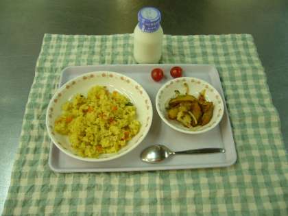 10月8日の給食は、メキシカンライス・アメリカンポテトサラダ・ミニトマト・牛乳でした。