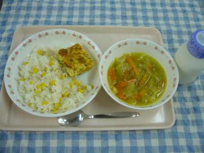 今日の給食は、コーンピラフ・ミニオムレツ・スパイシースープ・牛乳です。