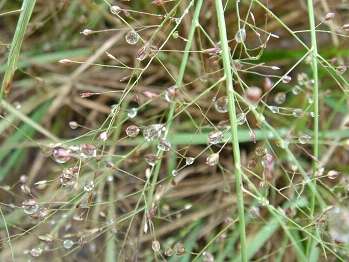 ☆雨のつぶが草についていて、それはそれは目を見張る美しさを感じました。雨の中でしたが、水滴(すいてき)が光って見えました。これは、カゼクサというどこにでもあるイネ科の植物です。