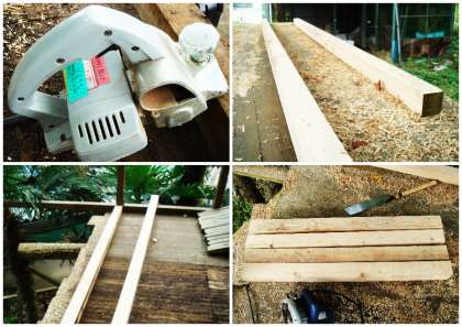 明日の月曜日にはクラブ活動があり、ツリーハウス作りの予定なので、今日は子どもではできない作業をしました。「手すり」の材木切りとカンナがけをしました。
