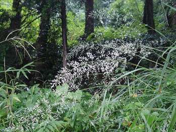 ☆またまたイネ科植物の登場です。山道を歩いていると、スギの林をバックにノガリヤスの花が目にとまりました。なんてすてきなんだろうと、思わず写真をとってしまいました。