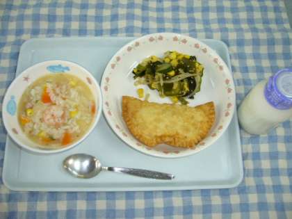 今日の給食は、えびリゾット・ベーコンポテトパイ・わかめサラダ・牛乳です。
