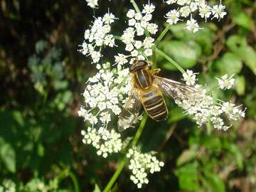 ☆目がしっかりとくっついているので、アブであることはわかりますが、その後が大変。何と言うアブなのか。くわしい人に聞いてみたところ一番ふつうのハナアブだそうです。