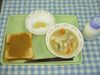 11月11日のこんだては、きなこトースト・味噌すいとん・りんごのコンポート・牛乳です。