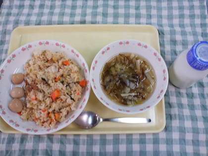 今日のこんだては、豚肉と青菜のチャーハン・もずくスープ・煮たまご・牛乳です。