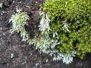 ☆左がギンゴケとよばれるもので、銀色をしています。また、右は葉っぱがまいてしまうので、ハマキゴケというそうです。どちらもどうろのえんせきによく見られます。