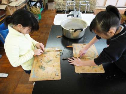 6年生が「和紙作り」に挑戦しました。コウゾをふかして外皮を取りました。