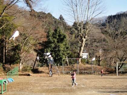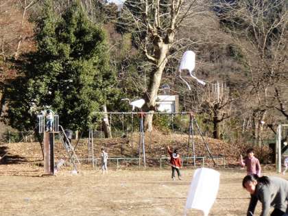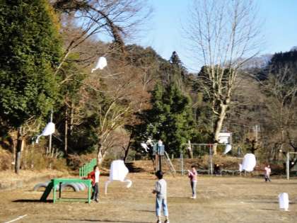 2年生が自作のタコあげていました。糸がからんでしまた子もいました。とても良い風が吹いていました。冷たかったですが。