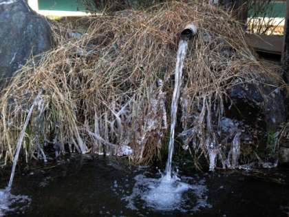 氷点下の毎日ですが、中庭の「池」が凍っていました。恩二小で3箇所の「沢水」が唯一流れています。