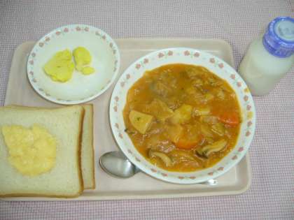 今日の給食は、セルフカスタードサンド・ポークシチュー・カリフラワーのカレーピクルス・牛乳です。