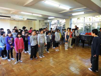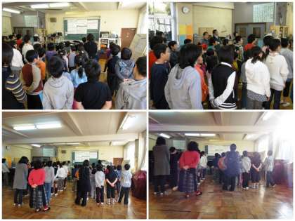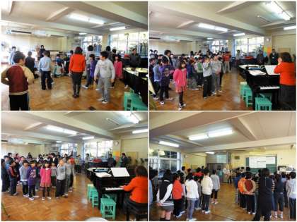 20日の音楽朝会では「桜の栞」という歌を歌いました。全児童が2つに別れて、初めて歌を合わせたそうですが、とても綺麗な声で歌ってくれました。