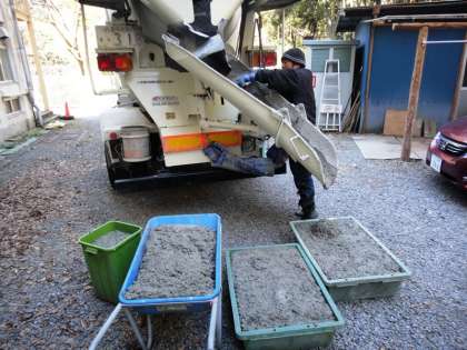 生コンが余ったので、うさぎ小屋の床にも生コンを入れることにしました。たくさんの入れものに生コンを入れていただきました。