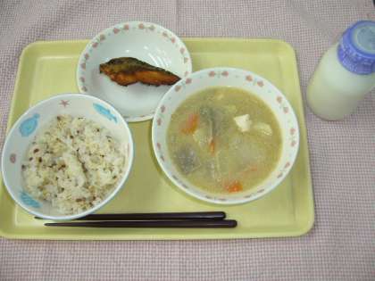 今日の給食は、雑穀ごはん・焼き魚(鮭のカレー焼き)・ごま汁・牛乳です。