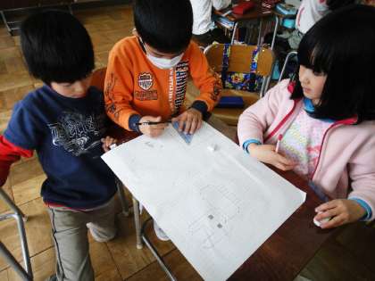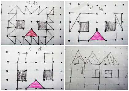 四角形と直角三角形を使って好きなものを描いて、色も塗っていました。