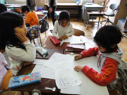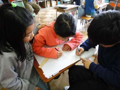 2年生が算数の四角形・三角形の学習のまとめとして好きなものを描いていました。