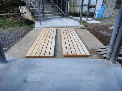 9日も、朝から渡り廊下のペンキ塗りをしました。マスキングに時間がかかりました。ペンキには「滑り止め」のための「珪砂」を入れました。