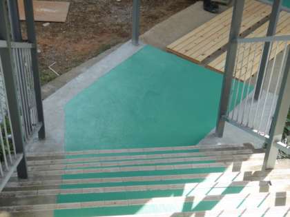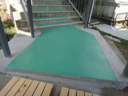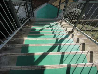 10日も、朝から渡り廊下のペンキ塗りをしました。マスキングに時間がかかりました。ペンキには「滑り止め」のための「珪砂」を入れました。