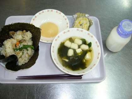 こんだては、菜の花が入った「ちらしずし焼き海苔つき」・ホールコーンが入った肉団子の「菜の花蒸し」・あれれはんぺん入りの「すまし汁」・くだもの(6年生からリクエストが多かった桃缶)・牛乳でした。