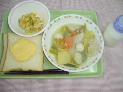 3月8日のこんだては、カスタードパン・洋風おでん・ナッツサラダ・牛乳でした。