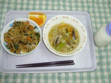 3月9日のこんだては、スタミナ丼・くずきりスープ・くだもの(スイートスプリング1/4)・牛乳でした。