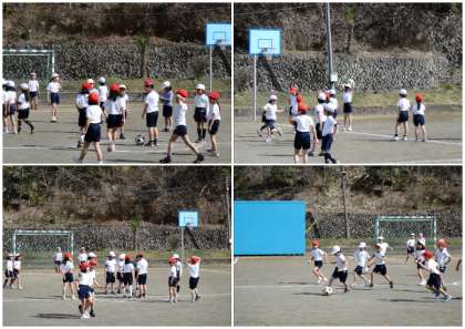 14日、1〜2年生が校庭でサッカーをしていました。見ている間に両チームとも1点入りました。