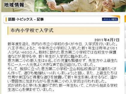 7日の「八王子テレメディア」の話題・トピックスに入学式の様子が掲載されていました。