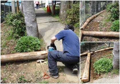 用務主事さんが校庭に下る坂に「丸太」を設置してくれています。重い丸太を自分で運び、設置してくれました。おかげで、土砂の流失が防げますし、子どもたちの校庭に行くときの安全も保てます。