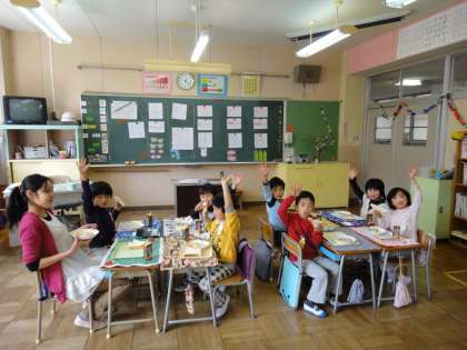 今日は、1年生の「給食開始日」でした。子どもたちは丁寧に準備し、いよいよ給食を食べました。