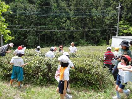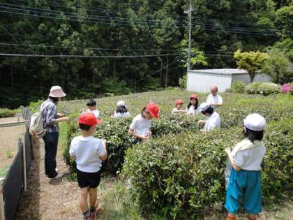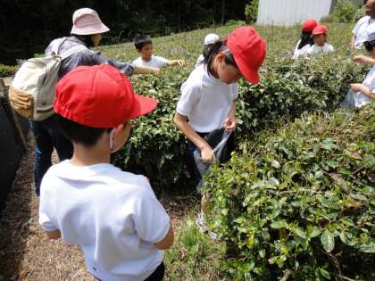 10日(火)の3〜4校時にお茶摘みをしました。20度を超える暑さの中でのお茶摘み。1年生もがんばりました。6年生は慣れたもので、一人で大量に摘んでくれました。