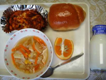 12日(木)の給食は「バターロールパン」「大豆と生パスタのグラタン」「ジュリエンヌスープ」「果物」でした。