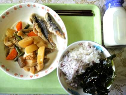 13日(金)の給食は「ゆかりご飯」「豆アジの唐揚げ」「ちくぜん煮」「わかめのニンニク炒め」でした。