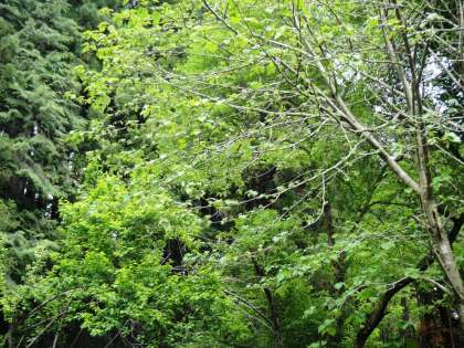 ツリーハウスの前のハンカチの木の葉が出てきましたが、昨年と変化はありません。白いハンカチのような葉は、今年も出ませんでした。
