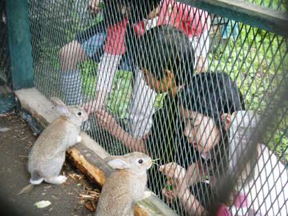放課後にバスの時刻まで20分間もあったので、たくさんの子どもたちがウサギにクローバーをあけるために集まってきていました。