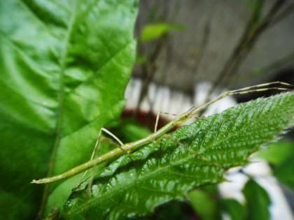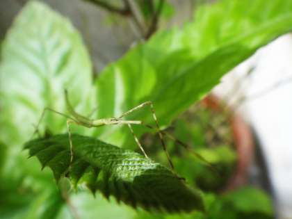 校舎の裏に「ナナフシ」の子どもが来ていました。ドングリの木の葉に来ていました。