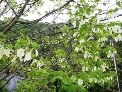 バス停の「駒木野」に、ハンカチノキが育ってきていました。きれいなハンカチのようでした。おそらく、植えてから15年はたっていると思います。