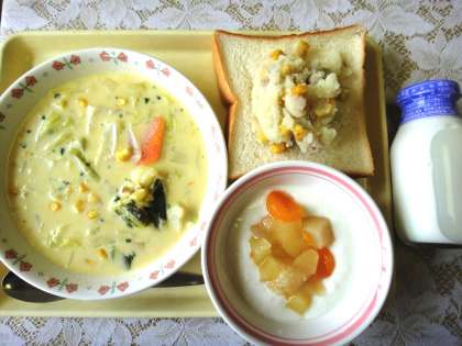 5月18日(水)の給食は、「マッシュ・サンド」「野菜のコーンクリーム」「フルーツヨーグルト」でした。