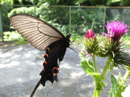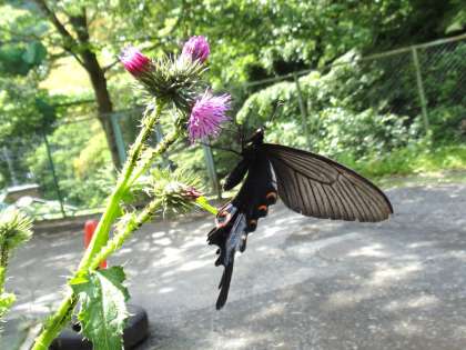 校舎の裏の「アザミ」に「クロアゲハ」が来ていました。
