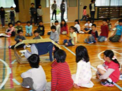 今朝の朝会は「ゲーム集会」でした。ダンボールの中に入ってパタパタと進むゲームでした。