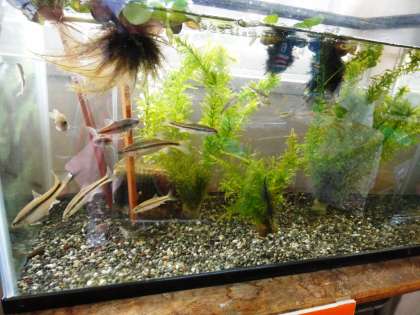 久しぶりで3年教室に行ってみると、何と水槽が4つもおいてありました。また、「アサギマダラのサナギ」や「オオムラサキのサナギ」「アゲハチョウの幼虫」などを飼育していました。「カブトムシの幼虫」も元気でいました。