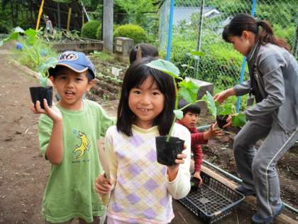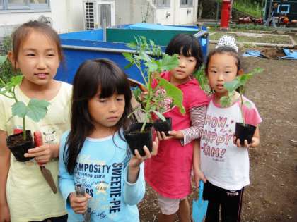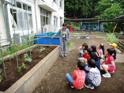 トマト、キュウリの苗を植えて、支柱もつけました。